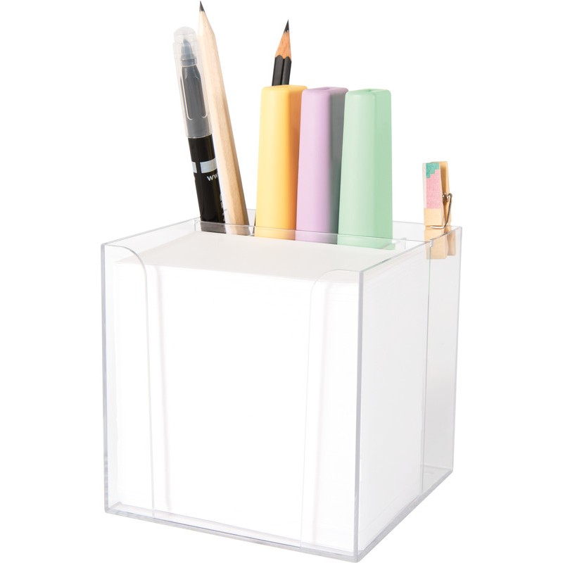 Boîte à fiches FOLIA® avec porte-crayons en PS, transparente, 70 g/m2, avec compartiment pour les instruments d'écriture, livrée avec env. 700 feuilles, format 55 x 90 mm. Dimensions: L 95 x H 95 x P 95 mm. Durabilité eco:plus: teneur en déchets recyclés après utilisation max. 100%. Certification: PEFC.
