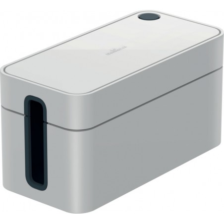 Boîtier range-câbles DURABLE Cavoline® en plastique retardateur de flammes, patins antidérapants, fentes de sortie en caoutchouc sur 2 côtés pour un rangement facile et une ventilation parfaite, pour ranger les câbles, couvercle avec une ouverture arrondie pour le passage d'un câble de chargement de smartphone. Durabilité eco:plus: recyclable. Box S pour une multiprise de 3 prises. Dimensions: L 246 x H 116 x P 128 mm.