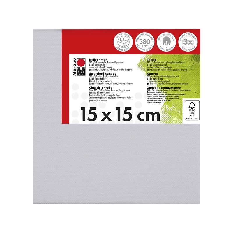 Châssis entoilé MARABU en bois, recouvert d'une toile blanche, 380 g/m2, 3 couches de préparation, légèrement absorbant, pour les peintures acryliques, à l'huile et gouaches, épaisseur des baguettes 18 mm. Durabilité eco:plus: recyclable. Certification: FSC.
