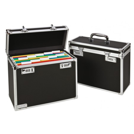 Malle de rangement pour dossiers suspendus LEITZ® malle de rangement flexible avec bords en aluminium, coins renforcés en métal, double serrure à combinaison. dimensions: L 366 x H 310 x P 165 mm rails intégrés pour 15 dossiers suspendus, pour la conservation de 2 classeurs A4, poignée en métal.