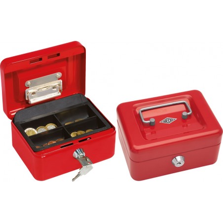 WEDO® Geldkassette mit Notenklammer aus pulverbeschichtetem, nahtlosgezogenem Stahl, versenkbarer Tragegriff, Münzeinsatz aus Kunststoff, im Deckel angebrachte Geldscheinklammer, Sicherheits-Zylinderschloss mit zwei Schlüsseln. grandeur 1, 4 casiers à monnaie dimensions: L 152 x H 80 x P 115 mm.