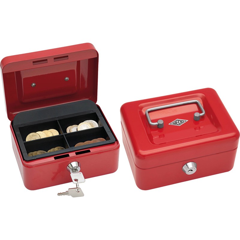 Caissette à monnaie WEDO® en métal thermolaqué, poignée escamotable, monnayeur en plastique, serrure à barillet et 2 clés. grandeur 1, 4 casiers à monnaie dimensions: L 152 x H 80 x P 115 mm.