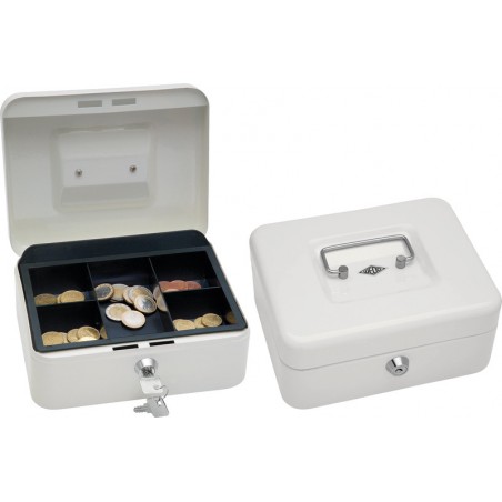 Caissette à monnaie WEDO® en métal thermolaqué, poignée escamotable, monnayeur en plastique, serrure à barillet et 2 clés. grandeur 2, 5 casiers à monnaie dimensions: L 200 x H 90 x P 160 mm.