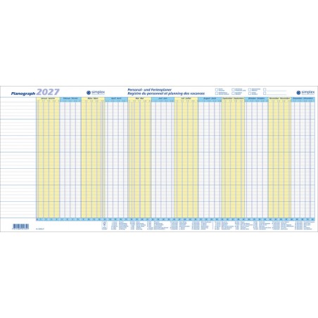 Planograph SIMPLEX en papier, 120 g/m2, blanc, registre du personnel et planning des vacances, recto impression 2 couleurs, calendrier en 2 langues all./fr., numérotation des jours en haut et semaines en bas, avec jours fériés suisses, emballage de 10 pièces, format: 64 x 29,7 cm. Durabilité eco:plus: emballage respectueux de l'environnement. Certification: FSC. 2027