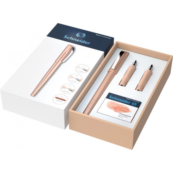 Stylo plume SCHNEIDER® Callissima avec plume à large bec, pour la calligraphie classique, corps et capuchon en plastique aux reflets métalliques doux et brillants, plume en acier fin, pour droitiers et gauchers, avec une cartouche d'encre (abricot ou bermuda blue). Durabilité eco:plus: durée de vie du produit prolongée.