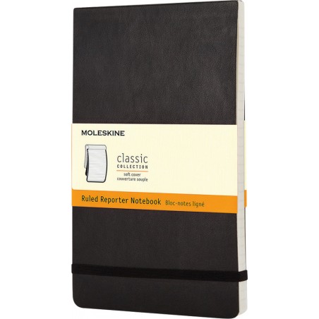 Carnet MOLESKINE® Classic Collection Reporter en PP, fermeture par élastique, coins arrondis, papier sans acide, 70 g/m2, pochette intérieure à soufflet en carton et toile, utilisable horizontalement et verticalement, 24 dernières pages détachables. Durabilité eco:plus: teneur en déchets recyclés après utilisation max. 50%. Certification: FSC. Pocket 90 x 140 mm, couverture souple, 192 pages