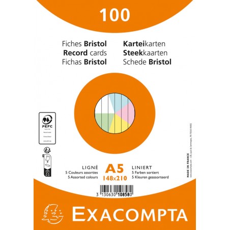 Cartes-fiches EXACOMPTA lignées en carton, 205 g/m2. Emballage de 100 pièces. Durabilité eco:plus: Certification: PEFC.