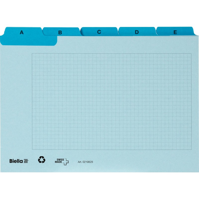 Cartes-guides alphabétiques A - Z BIELLA quadrillées en carton recyclé, 450 g/m2, onglets 5/5 renforcés, hauteur des onglets 9 mm. Jeu de 25 cartes. Durabilité eco:plus: composant recyclé.