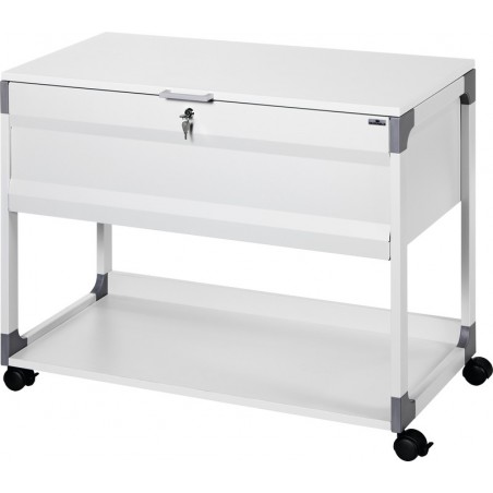 Chariot pour dossiers suspendus DURABLE System 100 Multi Top en acier avec revêtement époxy, pour env. 100 dossiers suspendus au format A4, avec couvercle fermant à clé, le couvercle s'ouvre à 90°, avec tablette inférieure, équipé de 4 roulettes dont 2 avec frein, livrée démonté avec les instructions de montage. Dimensions: L 897 x H 736 x P 432 mm. Durabilité eco:plus: recyclable, composant recyclé, teneur en déchets recyclés après utilisation max. 50%.