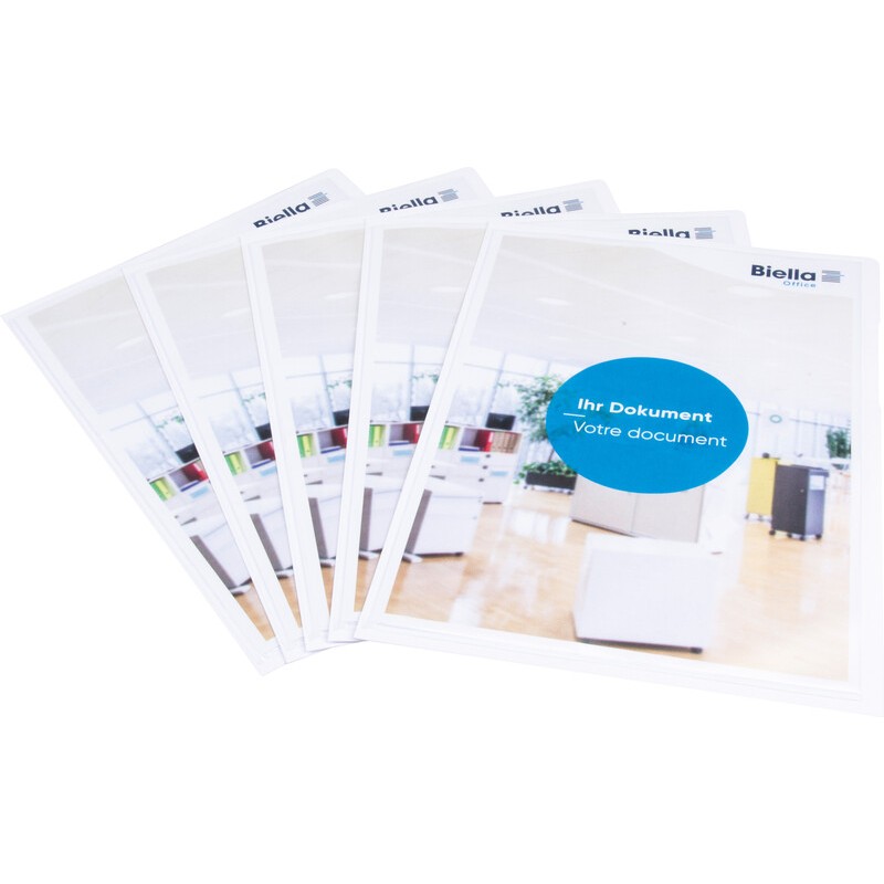 Dossiers d'organisation BIELLA Vista en carton, 250 g/m2, laminé mat, poche transparente sur la couverture, ouverture à droite et en haut, encoche de saisie, capacité max. env. 20 feuilles, pour format A4. Sachet de 5 pièces. Durabilité eco:plus: Certification: FSC.