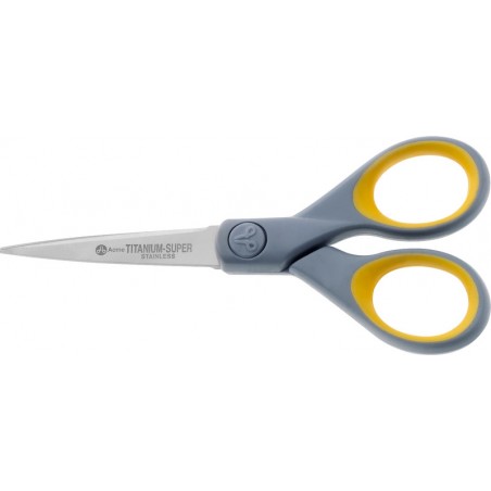 Ciseaux WESTCOTT® Titanium Super pour droitiers et gauchers, lames en acier inoxydable avec revêtement antiadhésif en nitrure de titane, anneaux gris/jaune ergonomiques avec intérieur en caoutchouc souple.