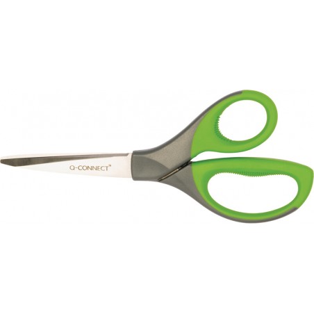 Ciseaux universels Q-CONNECT® Premium pour droitiers et gauchers, lames en acier inoxydable, anneaux confortables Soft Grip en PP vert/gris.
