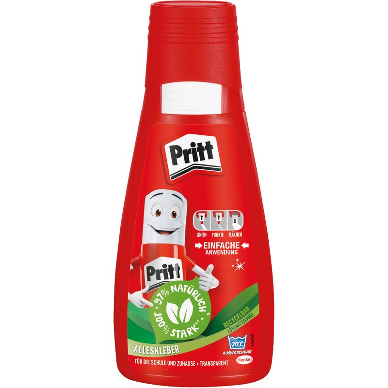 Colle multiusage PRITT colle de nombreuses matières comme le tissu, liège, feutrine, papier, carton, cuir, métal, verre, bois, plastique, lavable à 20°C, le papier ne gondole pas, embout avec fonction coulissante pour une application en points, cordons et surfaces, transparent, sans solvant, contient 97% de matières premières renouvelables.