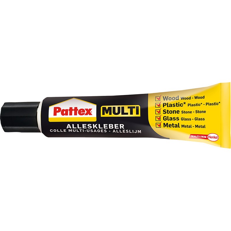 Colle multiusage PATTEX® Multi colle bois, métal, cuir, liège, papier, carton, polystyrène, tissu, etc., ne convient pas pour le PP, PE, Teflon®, résiste aux chocs, faible odeur, sèche rapidement et devient transparente, sans solvant, lavable à 60°C, ne goutte pas.
