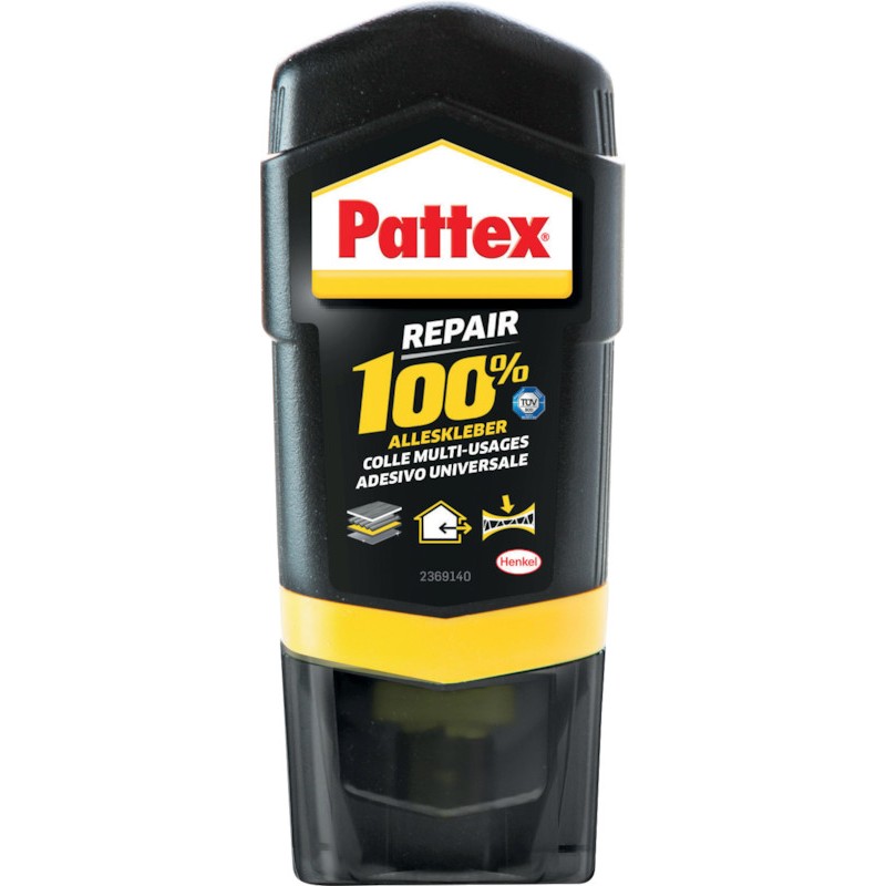 Colle multiusage PATTEX® 100% Repair colle multimatériaux, ne convient pas pour le PP, PE, Teflon®, flexible, transparent, résistante à l'eau, aux chocs et aux températures de -50 à +80°C, sans solvant, le système de fermeture intérieur garantit une colle toujours prête à l'emploi.