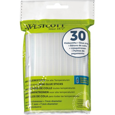 Bâtons de colle thermofusible WESTCOTT® pour pistolet à colle Mini pour toutes les températures. Dimensions: longueur 102 x Ø 7 mm. Emballage de 30 pièces.