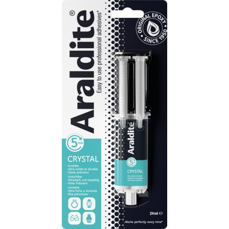 Colle à deux composants ARALDITE® Crystal colle haute transparence, à prise rapide, colle le bois, le métal, la porcelaine, le verre, le béton, le cuir et diverses matières plastiques (excepté PP, PE, Teflon®), résiste à l'eau et aux températures de -30 à +65°C, peut être poncée et vernie, sans solvant, temps ouvert 5 min., durcissement initial 20 min., prise définitive après 3 h.