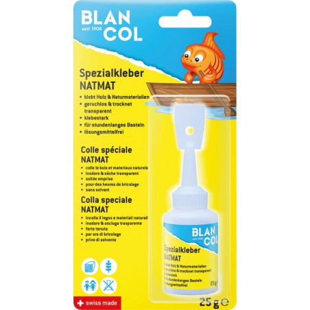 Colle spéciale BLANCOL Natmat colle le bois, le liège, les pommes de pin, le raphia, le lin, la paille, les fleurs séchées, les plumes, etc. sur presque toutes les surfaces, ne file pas, transparente après séchage, inodore, sans solvant, avec embout doseur et spatule, résiste à l'eau et aux températures de -10 à +60°C.