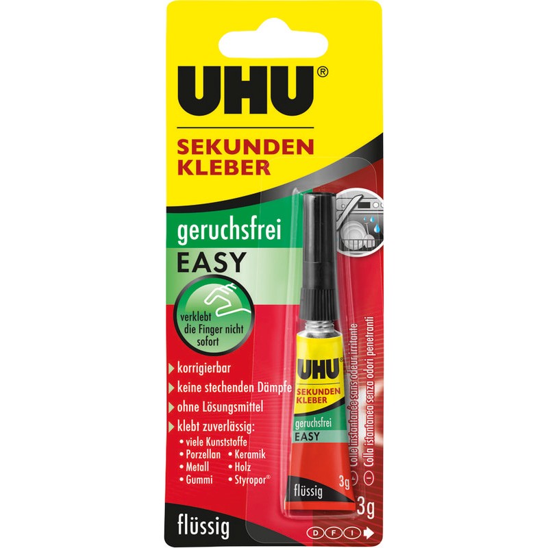Colle instantanée liquide UHU® Easy, sans odeur liquide, sans solvant, inodore, non irritante, idéale pour les matériaux lisses (y compris le polystyrène expansé), pénètre dans les plus petits coins et fissures.