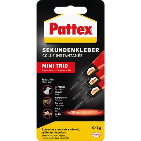 Colle instantanée liquide PATTEX® Mini Trio colle instantanée universelle pour toutes les réparations immédiates, colle presque toutes les matières, ne convient pas pour le verre, le PE et le PP, colle à prise immédiate, résistante à l'eau, sans solvant, 3 tubes pratiques de 1 g.