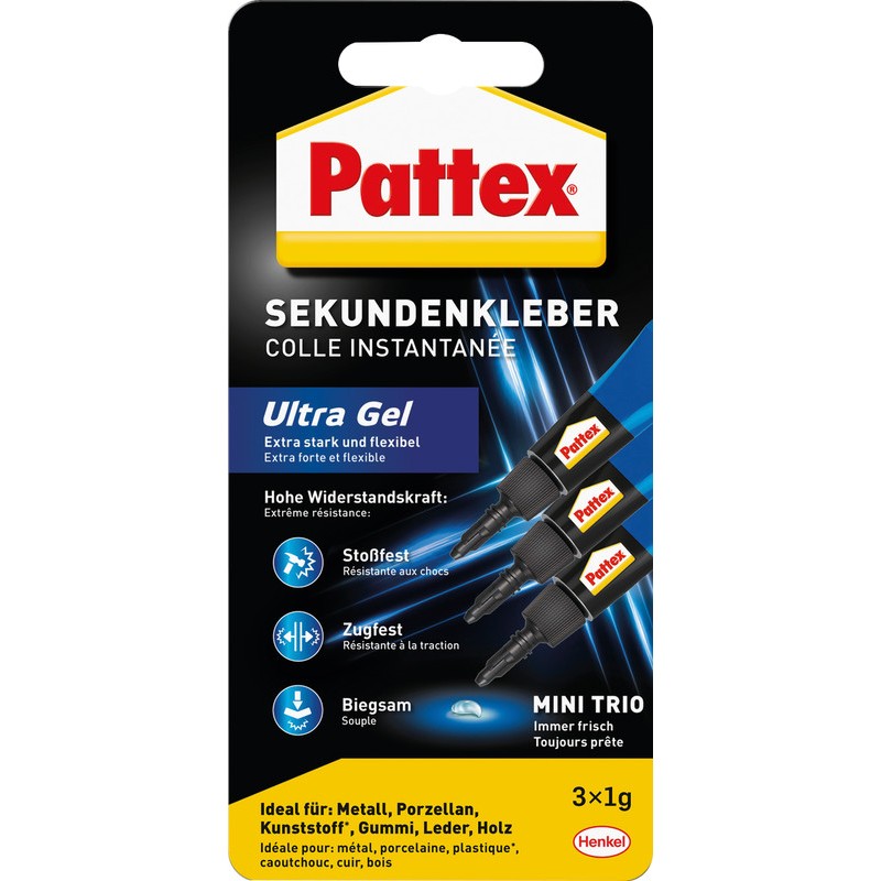 Colle instantanée PATTEX® Ultra Gel Mini Trio colle instantanée universelle pour toutes les réparations immédiates, colle presque toutes les matières, ne convient pas pour le verre, le PE et le PP, ajustable pendant quelques secondes, sous forme de gel, résiste aux chocs et à l'eau, amortit les vibrations, 3 tubes pratiques de 1 g.