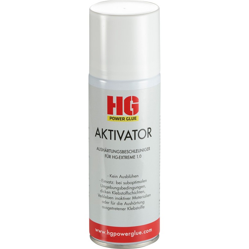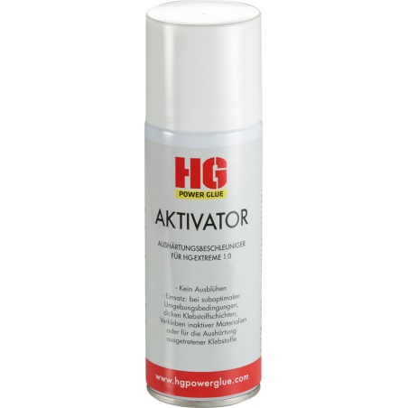 Accélérateur de durcissement HG POWER GLUE Aktivator favorise une prise rapide, destiné à une utilisation dans des conditions peu favorables, pour des couches adhésives épaisses, le collage de matériaux inertes ou le durcissement d'adhésifs qui fuient, sans efflorescence, résultat optimal si utilisé avec d'autres produits HG POWER GLUE. bombe aérosol