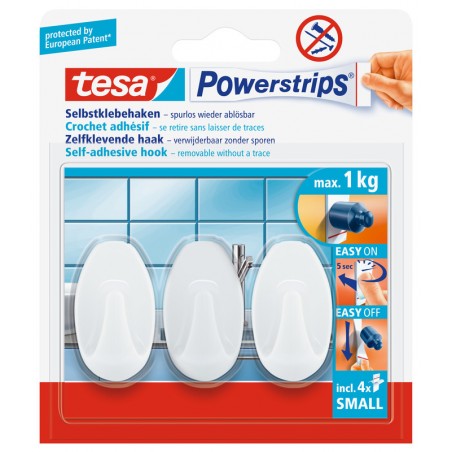 Crochets TESA® Powerstrips® Small pour suspendre des objets légers, se retirent sans laisser de traces, réutilisables avec une nouvelle Powerstrips®, supporte une charge jusqu'à 1 kg. Blister avec 3 crochets et 4 Powerstrips®.