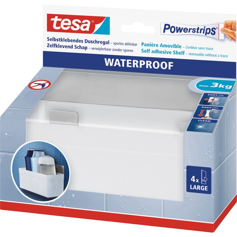 Panier TESA® Powerstrips® Waterproof Zoom à fixer sur les carreaux ou le verre dans la douche ou le bain, avec lingette pour traiter et préparer les surfaces, barrette à crochet en acier inoxydable, panier en plastique de qualité, idéal pour gel douche, shampoing ou ustensiles de cuisine, résiste au lave-vaisselle, se retirent sans laisser de traces, supporte des charges jusqu'à 3 kg. Blister avec 1 panier avec 2 Powerstrips®.