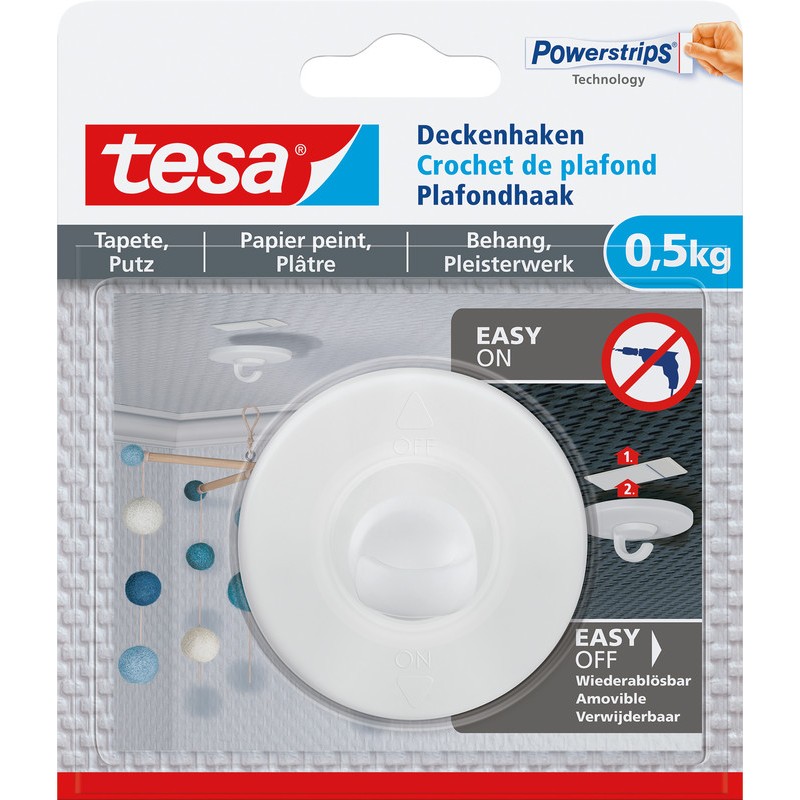 Crochets de plafond TESA® Powerstrips® pour papier peint & plâtre pour fixer au plafond des objets légers (mobiles), se retirent sans laisser de traces, réutilisables avec une nouvelle Powerstrips®, crochet pivotant, supporte une charge jusqu'à 0,5 kg. Blister avec 1 crochet et 3 Powerstrips®.