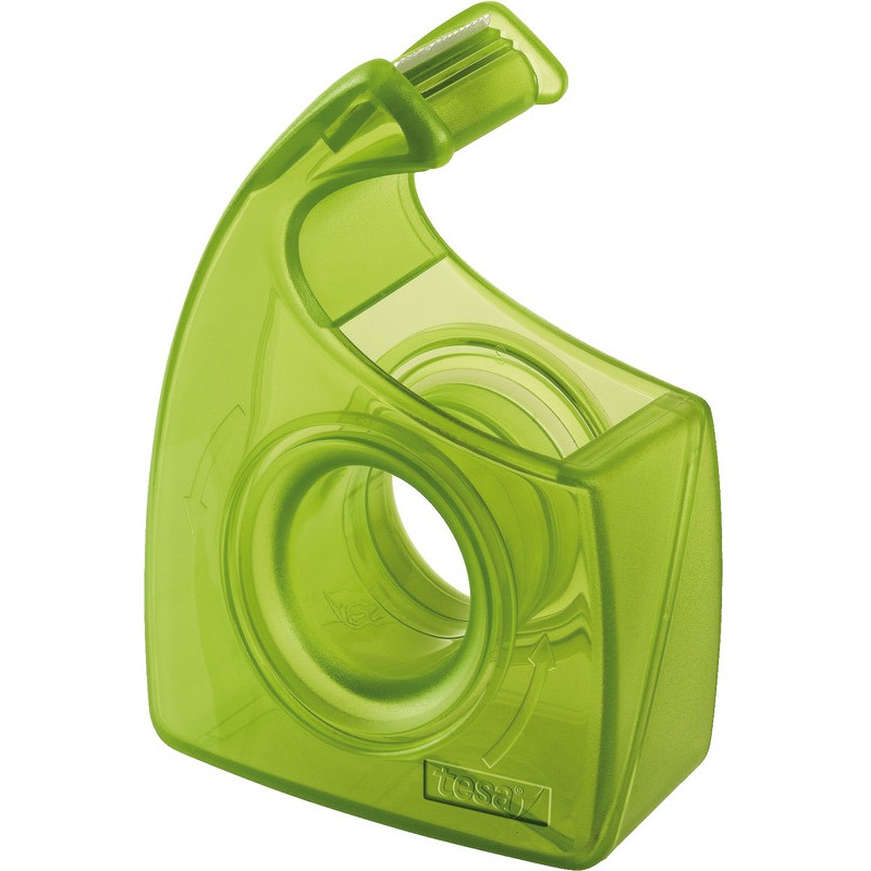 Dérouleur TESA® Easy Cut® ecoLogo® boîtier 100% en PE recyclé, avec couteau en métal, pour rouleaux de 33 m, largeur de rouleau jusqu'à 19 mm. Durabilité eco:plus: composant recyclé.