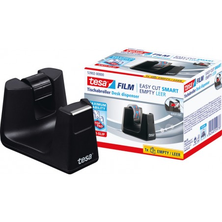 Dérouleur de bureau TESA® Easy Cut® Smart boîtier 100% en PS recyclé, pour rouleaux de 33 m, largeur de rouleau jusqu'à 19 mm, lame dentelée garantissant une découpe nette et propre, patin antiglisse pour une bonne stabilité sur la table, lavable pour réactiver le pouvoir adhésif, repositionnable sans traces. Durabilité eco:plus: composant recyclé, emballage respectueux de l'environnement.
