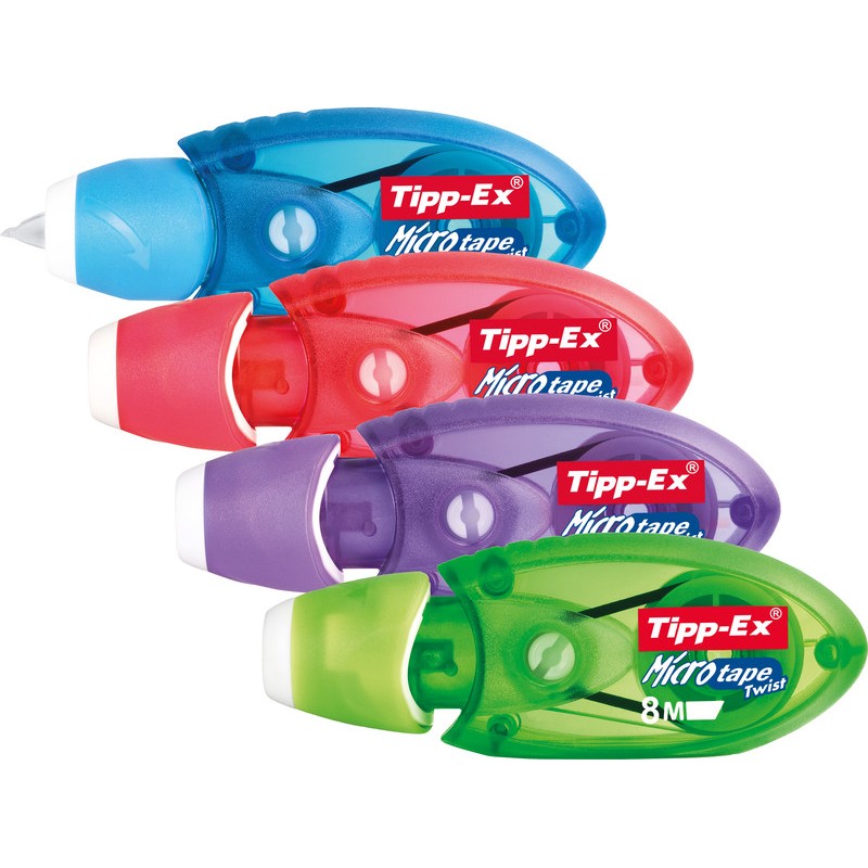 Roller de correction TIPP-EX® Micro Tape Twist pour les droitiers et les gauchers, ruban correcteur parfaitement opaque, réécriture immédiate, avec tendeur de bande, capuchon pivotant novateur pour faire apparaître la bande, non rechargeable, couleurs assorties, bleu, rouge, vert et violet.