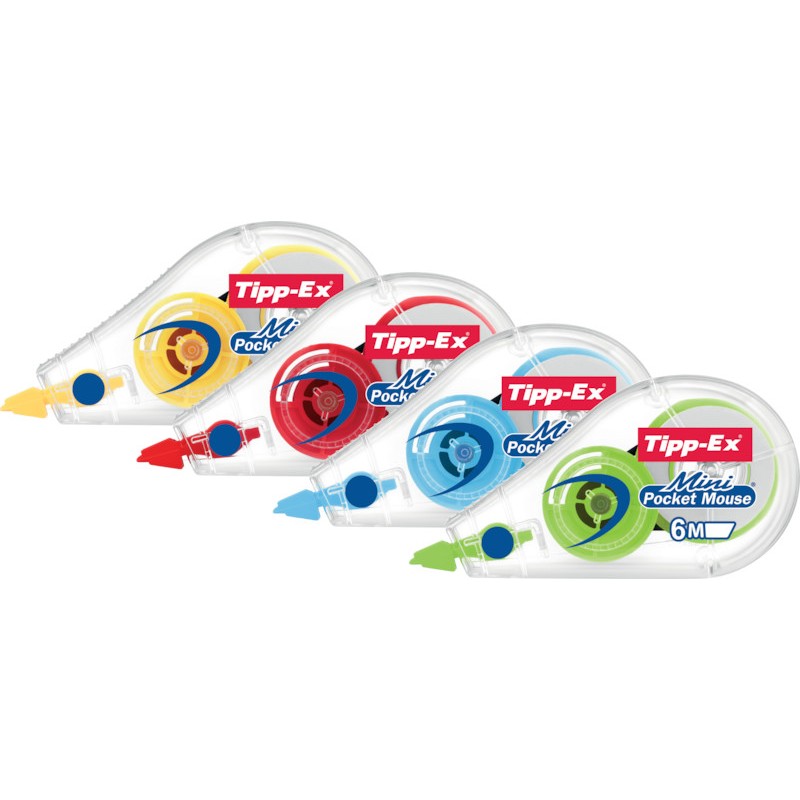 Roller de correction TIPP-EX® Mini Pocket Mouse Fashion pour les droitiers et les gauchers, ruban correcteur parfaitement opaque, réécriture immédiate, mécanisme de rembobinage, ruban indéchirable (PES), indétectable sur les photocopies, boîtier transparent avec mécanisme en couleur, en PP, non rechargeable, couleurs assorties, jaune, rouge, bleu et vert.