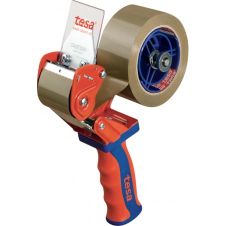 Dérouleur pour ruban d'emballage TESA® Comfort dérouleur robuste avec cadre métallique, frein de rouleau et lame recouverte d'une protection, poignée en caoutchouc souple, pour rouleaux jusqu'à 66 m.