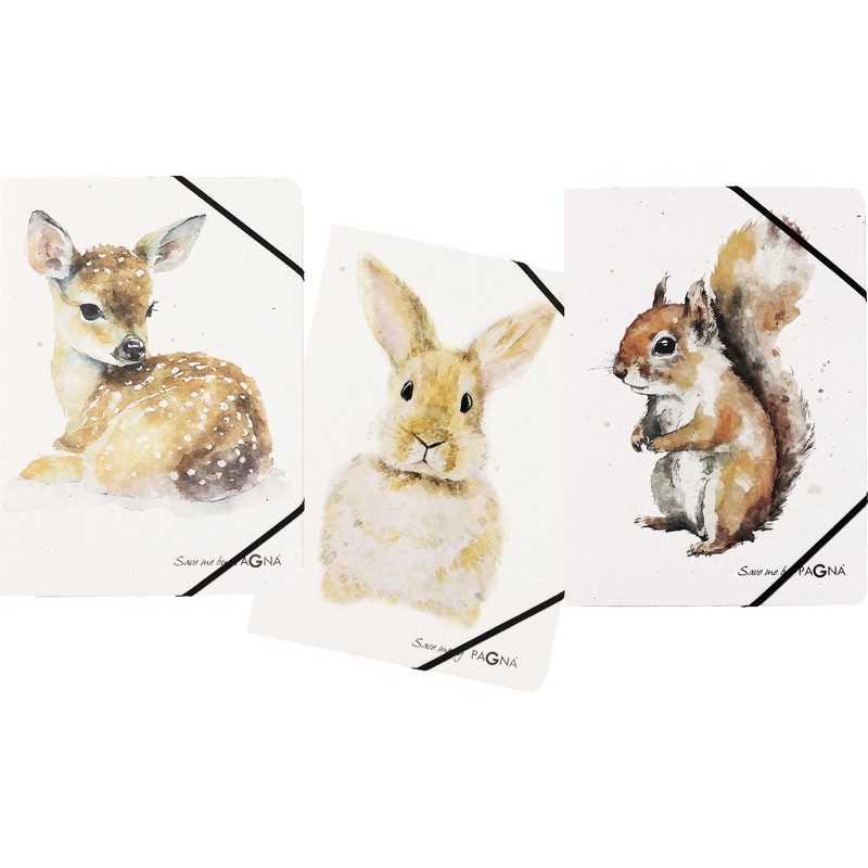 Chemise à élastique PAGNA® Save me en carton recyclé, avec 3 rabats, avec fermeture par élastique, capacité max. 20 mm, pour format A4, 3 motifs assortis, dans le style de la peinture à l'aquarelle. Durabilité eco:plus: recyclable. No. 4, Chevreuil, Lapin, Ecureuil