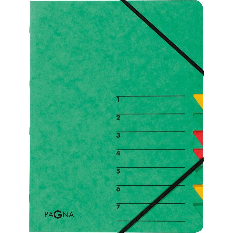 Dossier à compartiments PAGNA® Easy en presspan, avec onglets de couleur, première page avec index, avec fermeture par élastique, pour format A4. Durabilité eco:plus: recyclable.