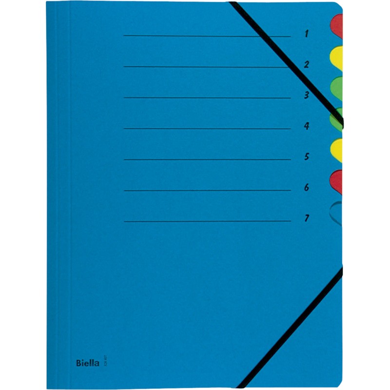 Dossier à compartiments BIELLA reliure en carton de couleur, bleu, 450 g/m2, contenu en carton de couleur, 320 g/m2, première page avec index, avec fermeture par élastique, pour format A4. Durabilité eco:plus: Certification: FSC, The Blue Angel.