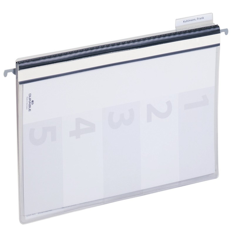Dossier pour la gestion du personnel DURABLE pour documents perforés, couverture personnalisable pour documents A4 avec index, porte-étiquette sur toute la hauteur du dossier, logiciel d'étiquetage sur www.duraprint.fr, avec 5 intercalaires équipés chacun d'un onglet et d'un système à lamelles, livré avec cavaliers et tringle de suspension, avec poche dans le couvercle pour les documents non perforés, pour format A4. Durabilité eco:plus: recyclable.