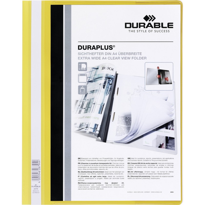 Dossier-classeur DURABLE Duraplus® en plastique, couverture transparente faisant fonction de pochette A4, dos en couleur avec pochette intérieure transparente, gouttière pour la tringle de suspension, bande d'inscription sur toute la hauteur, extralarge, avec 2 languettes pour perforation 80 mm, capacité max. 100 feuilles, pour format A4+. Durabilité eco:plus: recyclable.