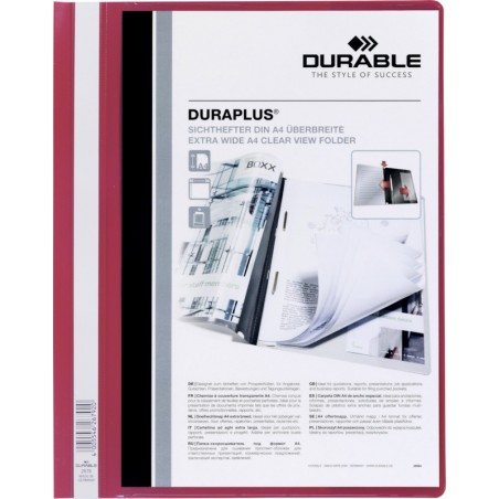 Dossier-classeur DURABLE Duraplus® en plastique, couverture transparente faisant fonction de pochette A4, dos en couleur avec pochette intérieure transparente, gouttière pour la tringle de suspension, bande d'inscription sur toute la hauteur, extralarge, avec 2 languettes pour perforation 80 mm, capacité max. 100 feuilles, pour format A4+. Durabilité eco:plus: recyclable.
