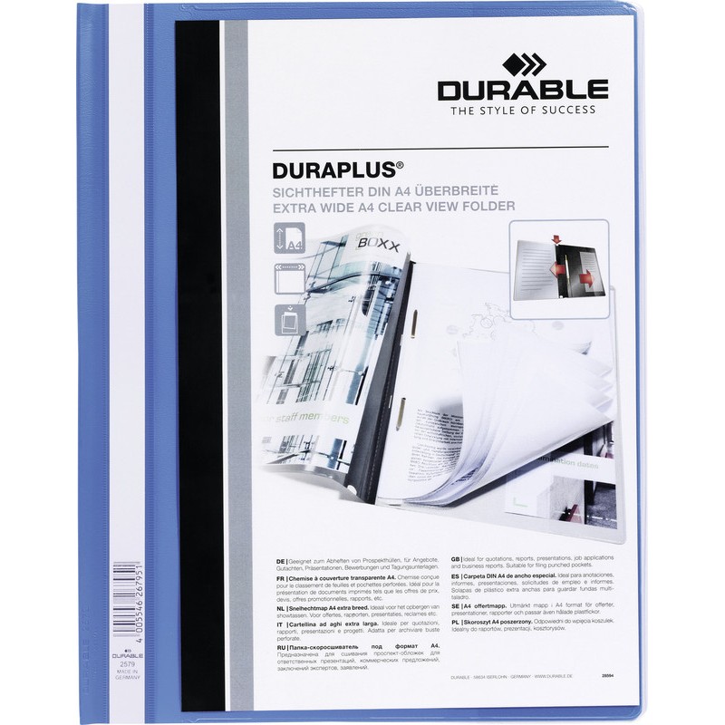 Dossier-classeur DURABLE Duraplus® en plastique, couverture transparente faisant fonction de pochette A4, dos en couleur avec pochette intérieure transparente, gouttière pour la tringle de suspension, bande d'inscription sur toute la hauteur, extralarge, avec 2 languettes pour perforation 80 mm, capacité max. 100 feuilles, pour format A4+. Durabilité eco:plus: recyclable.