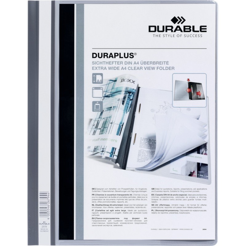 Dossier-classeur DURABLE Duraplus® en plastique, couverture transparente faisant fonction de pochette A4, dos en couleur avec pochette intérieure transparente, gouttière pour la tringle de suspension, bande d'inscription sur toute la hauteur, extralarge, avec 2 languettes pour perforation 80 mm, capacité max. 100 feuilles, pour format A4+. Durabilité eco:plus: recyclable.