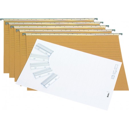 Set de dossier suspendu BIELLA ORIGINAL olive 25 cm en carton fort, très résistant, tringles de suspension métalliques équipées de coussinets en nylon, format 32 x 25 cm. Set composé de 5 dossiers suspendus, 5 cavaliers en plastique et 51 étiquettes en papier blanches.