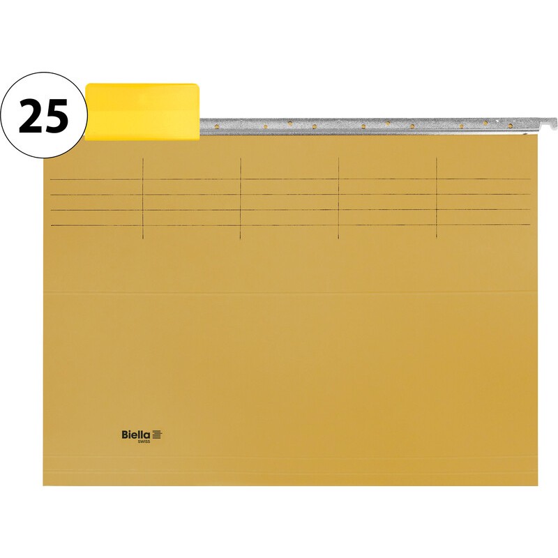 Set de dossiers suspendus BIELLA ORIGINAL en couleur en carton très résistant, tringles de suspension métalliques équipées de coussinets en nylon, format 32 x 25 cm. set de 25 pièces set composé de 25 dossiers suspendus, 25 cavaliers métalliques, 25 manchons et 27 étiquettes blanches.