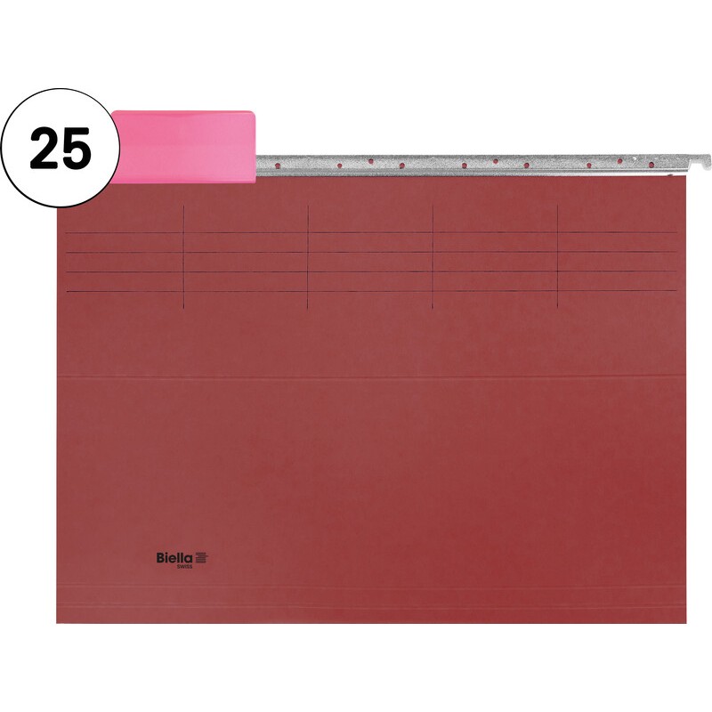 Set de dossiers suspendus BIELLA ORIGINAL en couleur en carton très résistant, tringles de suspension métalliques équipées de coussinets en nylon, format 32 x 25 cm. set de 25 pièces set composé de 25 dossiers suspendus, 25 cavaliers métalliques, 25 manchons et 27 étiquettes blanches.