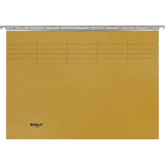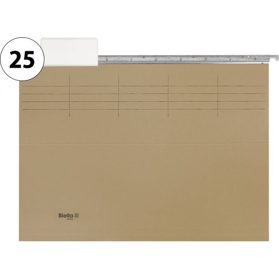 Set de dossiers suspendus BIELLA ORIGINAL en couleur en carton très résistant, tringles de suspension métalliques équipées de coussinets en nylon, format 32 x 25 cm. set de 25 pièces set composé de 25 dossiers suspendus, 25 cavaliers métalliques, 25 manchons et 27 étiquettes blanches.