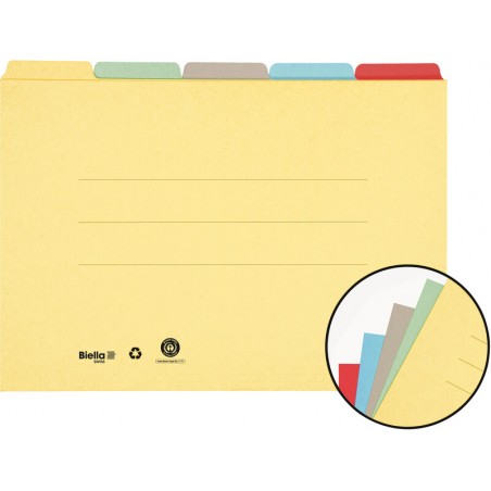 Dossiers-répertoires BIELLA en carton recyclé de couleur, 320 g/m2, 5 plis, capacité 190 feuilles, volet antérieur raccourci, hauteur des onglets 13 mm, 3 lignes sur la couverture destinées aux inscriptions, pour une organisation optimale au sein du dossier suspendu BIELLA ORIGINAL, les chemises sont universelles et s'insèrent parfaitement dans d'autres chemises, couleurs assorties, bleu, vert, jaune, rose et gris. Emballage de 5 pièces. Durabilité eco:plus: composant recyclé.