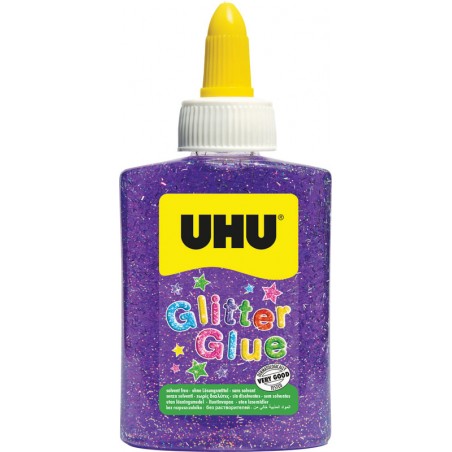 Glitter Glue UHU® avec des particules de paillettes pour des collages créatifs et décoratifs sur de nombreux supports comme le papier, le carton et le bois, flacon souple avec embout de précision, ne goutte pas et ne file pas, sèche au toucher en 30 min. et complètement sèche après environ 12 h, sans solvant, ne résiste pas au lavage, testé sous contrôle dermatologique. bouteille de 88,5 ml