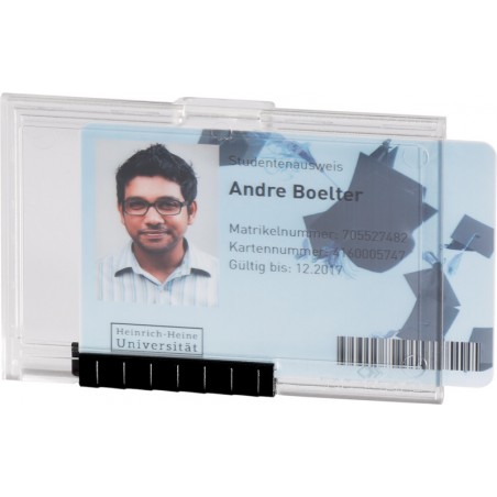 Porte-badges DURABLE Pushbox retrait individuel des cartes grâce au bouton-poussoir, des compartiments individuels protègent p. ex. les cartes avec bande magnétique d'un endommagement, utilisation au format portrait ou paysage, peut être combiné avec une chaînette, un clip, un ruban textile ou un enrouleur. Dimensions: L 87 x H 54 mm. Emballage de 10 pièces. Durabilité eco:plus: recyclable.