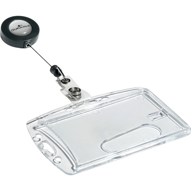 Boîtiers rigides DURABLE pour badges d'entreprise transparents, protègent de la saleté, accès à la carte facilité par une encoche au dos, utilisation au format portrait ou paysage. Dimensions intérieures: L 87 x H 54 mm. Durabilité eco:plus: recyclable, composant recyclé, teneur en déchets recyclés après utilisation max. 8%. avec enrouleur longueur max. du cordon 800 mm. Emballage de 10 pièces.